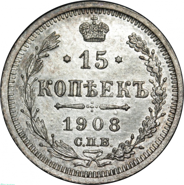 Россия 15 копеек 1908 года СПБ ЭБ UNC